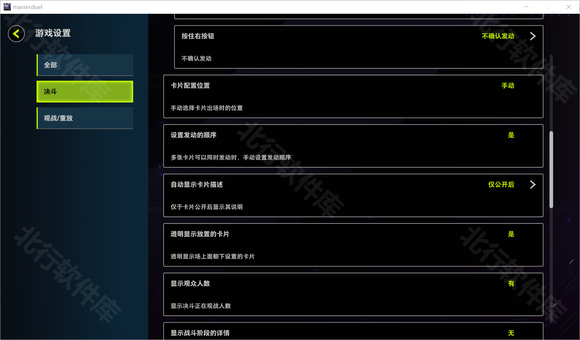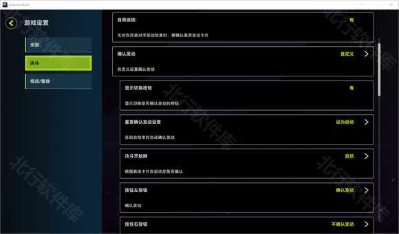 在账号初始准备前,玩家需要调整一些设置。设置入口位于主界面右上角的三道杠处,选择第一个游戏设置进入。重要的是调整决斗界面的一些设置,如“自我连锁”、“确认发动”、“卡片配置位置”和“设置发动顺序”,可以根据推荐设置进行调整。