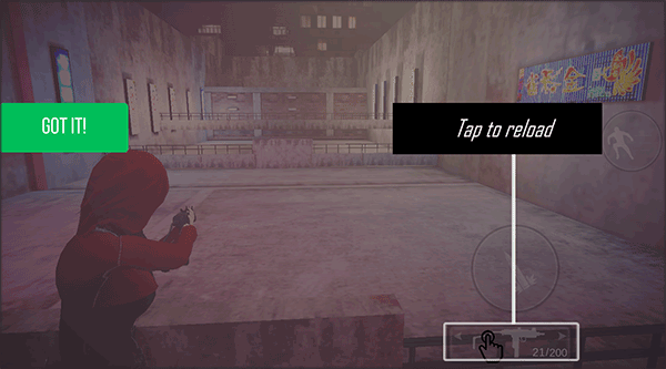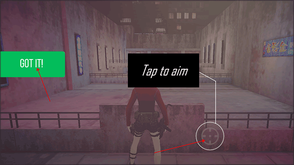 1、下载安装流氓特工手游,进入游戏,如图点击左边继续,点击右边瞄准。
