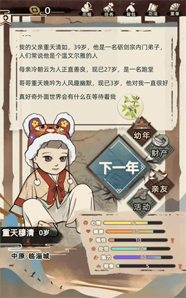 1.开启人生后会随机生成人生信息,通过不断的开始新人生刷新出自己想要的姓氏、长相和六维数据等,同时可以刷一下父母的职位,职位外门或内门影响后面功法提升速度和金钱