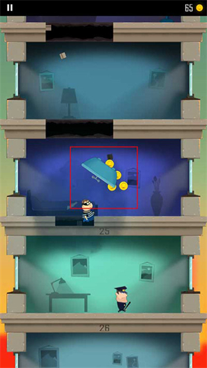 1、游戏开始会有一个小偷开始跑到另一层楼,玩家需要做的就是通过角色屁股着地的方式破开楼层,这样就能不断到达底下那一层了;