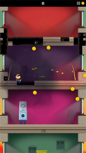 在这款游戏中,操控方式十分简便,只需滑屏就能实现对游戏的控制。向上滑屏,人物就会跳跃;向下滑屏,人物则以吨位砸向楼层。而且,人物会自动左右移动,玩家仅需凭借自己的判断找准方向砸楼层即可。游戏一开始便配备了详尽的新手教程,助力玩家快速上手,难度不大。伴随着紧张刺激的警鸣音效,以及砸楼层时楼板坍塌的声音,只要基本不出现误操作,玩家就能最大程度地体验到惊险破坏带来的乐趣。