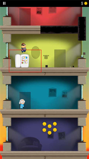 4、角色到达每一个楼层时,里面的东西都会不一样,有些是板凳、冰箱、煤气罐等,下面我为大家来介绍这些东西的作用,冰箱是类似护盾的功能,用来抵挡一次导弹、警察的攻击;
