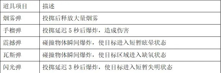 大家虽然可以在商店中购买道具,但对萌新来说太“奢侈”了。所以还是在地图中的投掷物品箱和敌人手中缴获比较好。这里最推荐的是紫色震撼弹,可以让敌人被控几秒,不论是进攻还是跑路都非常好用。至于其他投掷类道具,各位萤火虫可以参照下面的表格,按喜好搭配。