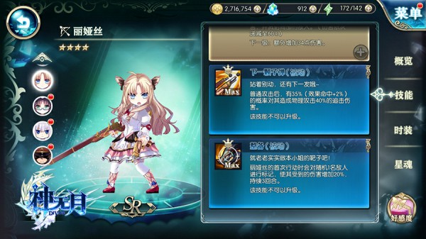 丽娅丝是来自科技浮岛麦格亚斯的大小姐,虽然身份尊贵,但这位大小姐却完全没有趾高气昂的嚣张气焰,是一个完全的自来熟,能和所有品阶的人都玩在一起。这样的人设,在剧情和现实中都吸引了大量人气。除了人设和颜值出类拔萃,丽娅丝的声优也请到了在驾驭傲娇系萌妹子方面公认TOP的竹达彩奈。而她的养成难度比较低,尤其在灵魂石收集方面,除了解锁好感度日记等方式,完成冒险世界的星星收集任务还能够一次性解锁超多灵魂石哦~