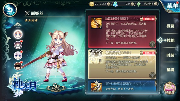 在技能方面,大小姐表现的比较有特色也比较强力。其中最出彩的就是被动技能“下一颗子弹”。在丽娅丝普攻后,有35%的几率追加一次攻击,并且这个被动释放的几率是受效果命中影响的。也就是说,只要堆够足够高的效果命中。丽娅丝有相当大的几率进行两次攻击,这在PVP中对敌方来说可能是致命的威胁,可以迅速的压低敌方前排的血线,甚至可以通过射程优势完成后排狙杀。在26级后,丽娅丝会拥有第二个被动“整备”,这个技能支持丽娅丝在开场就对一名敌人随机进行标记,并带来三回合增伤20%的debuff。这个技能在PVP中效果相当好,尤其是标记到前排单位的时候,本方很有机会集火秒杀这名敌人。