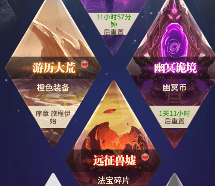 比起第一天,今天的大荒又开放了三个新玩法,游历大荒、幽冥诡境和远征兽墟。