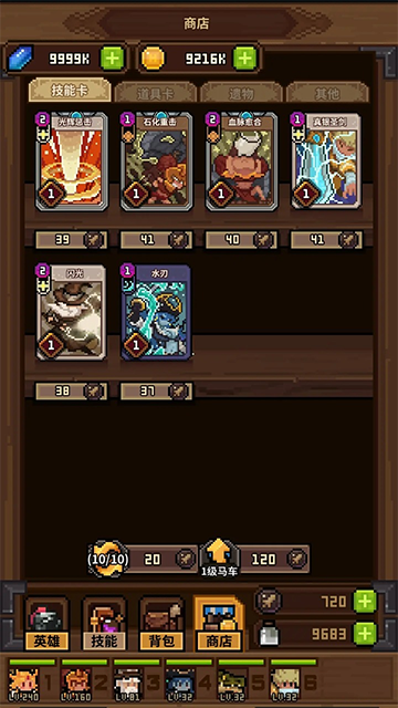 1、玩法有些常规的数值卡牌游戏,战斗融入了一定肉鸽元素,可以在商店购买道具卡,也有经典三选一增强英雄属性。英雄本身技能有卡组设定,可以自由搭配,战斗中随机抽取。但战斗本身是可以自动的,也支持自动释放技能和多倍加速,英雄技能卡牌设定就变成了鸡肋,与常规卡牌无异。