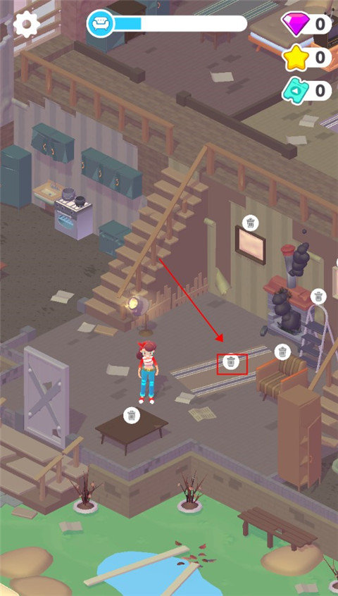 1、首先我们打开游戏,首先需要将这座废弃的房子收拾一番,拖动物品可以将物品放在箱子里