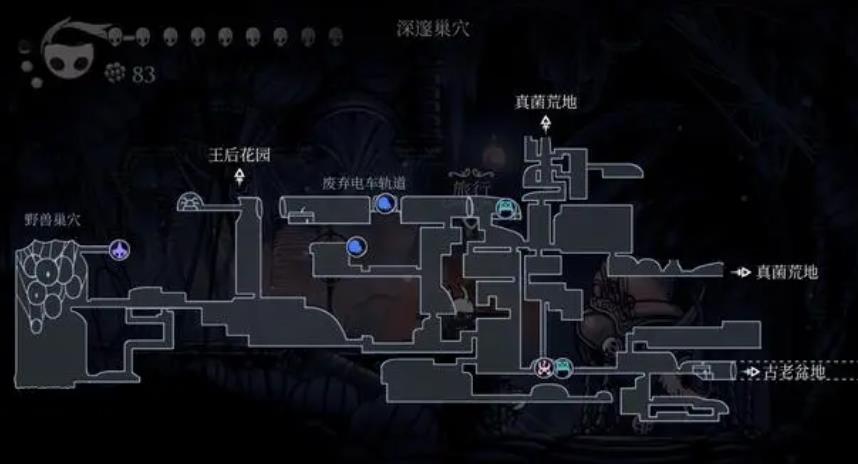 从【王后花园】往下走进入【深邃巢穴】。深邃巢穴里面有电车通行证,获得之后便可以使用电车。电车有深邃巢穴、古老盆地和王国边缘三个站点。