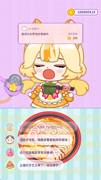 史莱姆拉面达人是一款将吃播与食物制作进行融合的游戏,游戏内提供了各种各样的食材,玩家可以根据自己的喜好进行搭配,完成创作后就能够进行品尝了,然后系统会根据搭配的情况给出想要的得分,喜欢的朋友们快点来下载试试吧,将美食制作与直播互动巧妙结合,为玩家带来全新的吃播体验,你不仅能亲手制作美味料理,非常有意思的游戏。