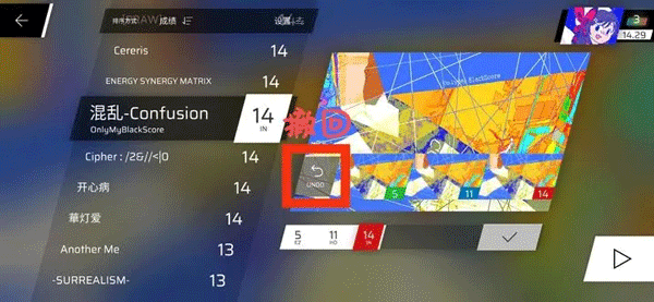 你可以使用难度选择按钮上面的 “←UNDO” 键来撤销刚刚选择的谱面,然后替换成另一张你想打的。