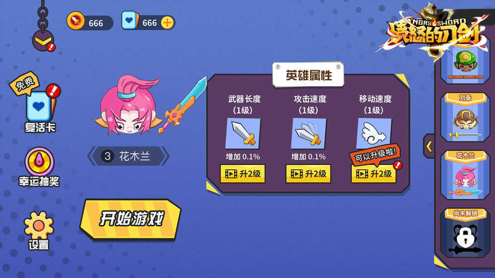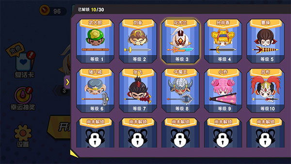 2、游戏打造各种造型各异的人物形象,有花木兰、关羽、猪八戒等等,玩家需要积攒金币来解锁这些厉害的人物;