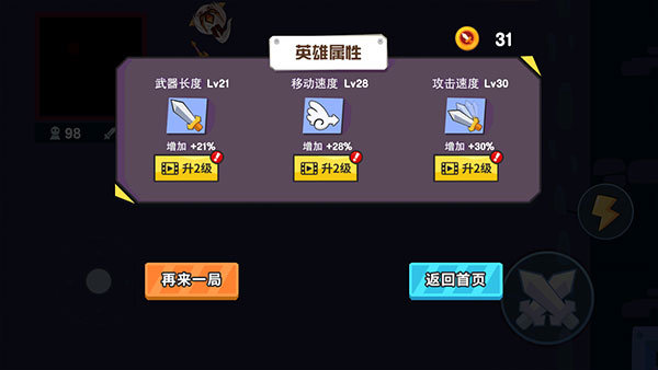 一局比赛结束领取金币奖励,可以升级武器的长度、角色移动速度。