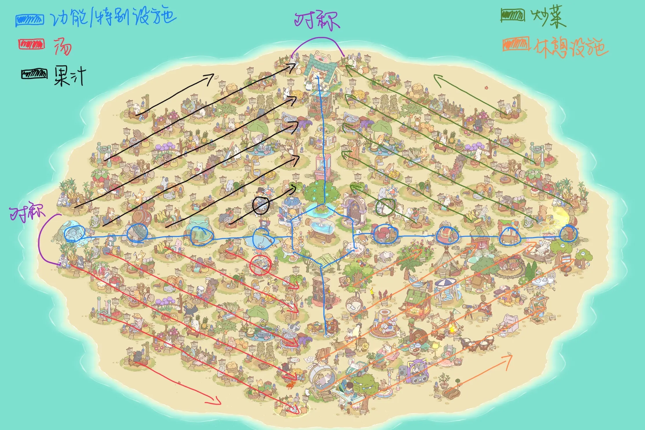 煮汤区和果汁区是对称的,果汁区和炒菜区是对称的,休憩设施是单独的,因为不同设施的数量不一致,所以没有办法完全对称,只能做到现在这样,感觉对强迫症还挺友好的