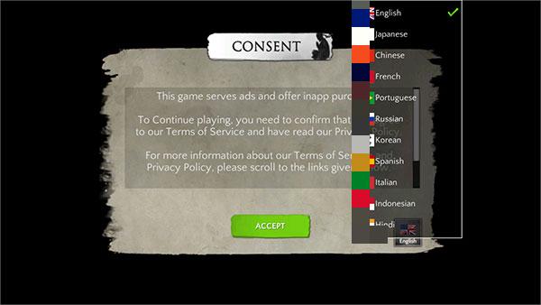 1、设置中文有两种方法,第一种是在玩家首次进入游戏的时候,点击协议右下方的国旗,再选择Chinese即可。