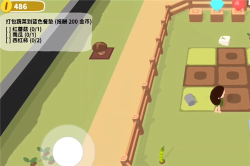 2、如上图任务是将蔬菜打包到蓝色餐垫里,这个时候我们只需要操作角色去将上面说的菜都种下。