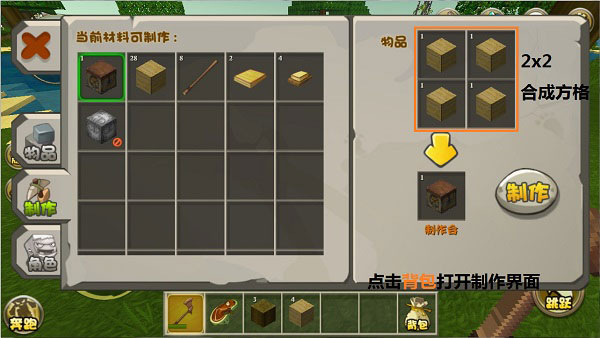 答:轻轻一点制作台,就会打开制作界面,当你身上有材料时,制作界面就会自动显示相关的工具。