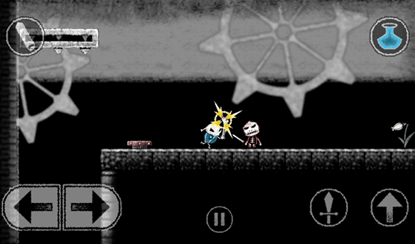 1、左侧按键控制小骷髅左右移动,右侧按键控制攻击,靠近摇杆可进行交互操作。
