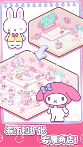 购物城重建与扩展:游戏的主线目标是帮助HelloKitty和酷洛米重建和扩展荒废的购物城。玩家可能需要解锁新的区域、建造不同类型的店铺(如咖啡馆、服装店、玩具店等)。