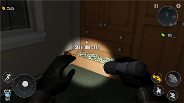 2,屏幕左边是控制方向按钮,右边分别是蹲下,跳跃,拾取按钮抢劫模拟器小偷之家游戏
