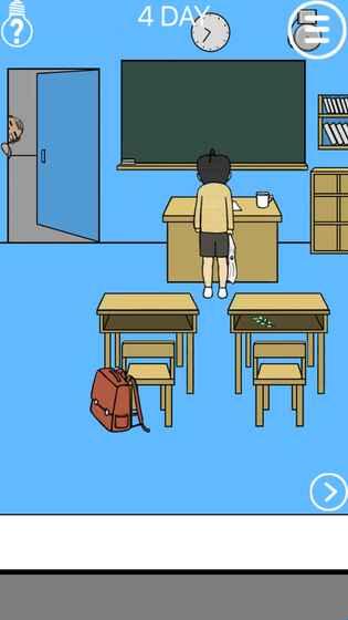 到右边,点击地面略显白色的地方可获得一件神秘的隐形衣,然后回到左边,点击一下教室门,等人物出现后快速拖动隐形衣将它套到人物身上,这样就可以在隐形状态逃出教室了。