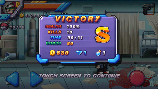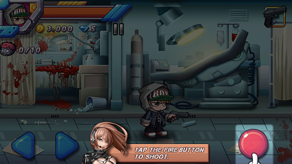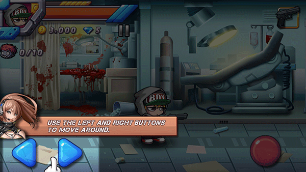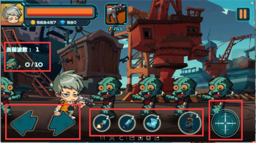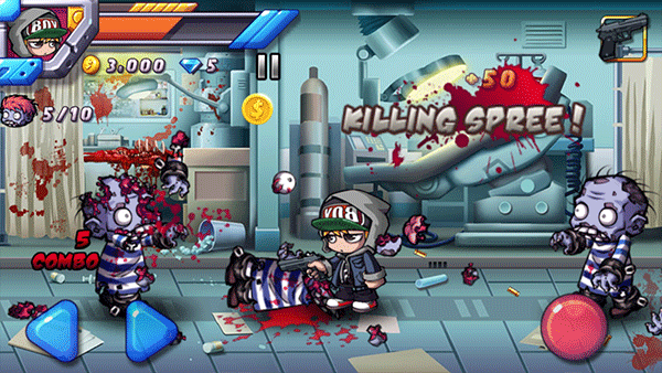 玩家点击屏幕下方按钮,控制人物左右移动以及射击。不过如果前后僵尸夹击的话,恐怕离死期不远了。游戏中,玩家要完成一个个人物来获得奖励,用这些奖励来升级人物的生命、速度等属性,或购买更强的武器装备,而人物选择方面就只能用人民币来购买了相对于网游来说,还是超级划算的,仅需要区区几元钱即可获得超值属性,玩起来更爽快。