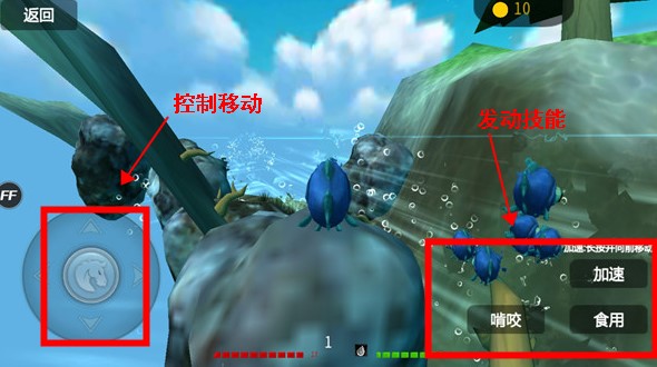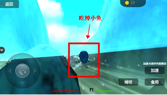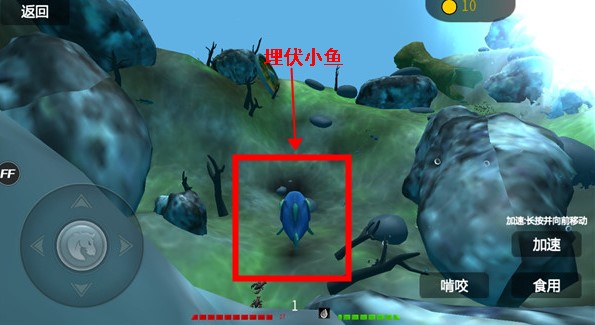 4.而且玩家可以找一处地方藏起来等待鱼类经过,点击加速猛冲上去就可以吃掉。