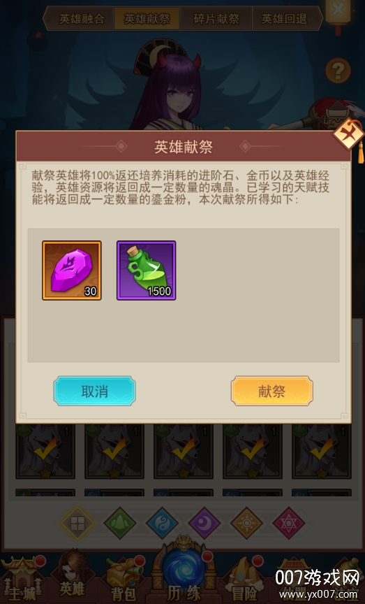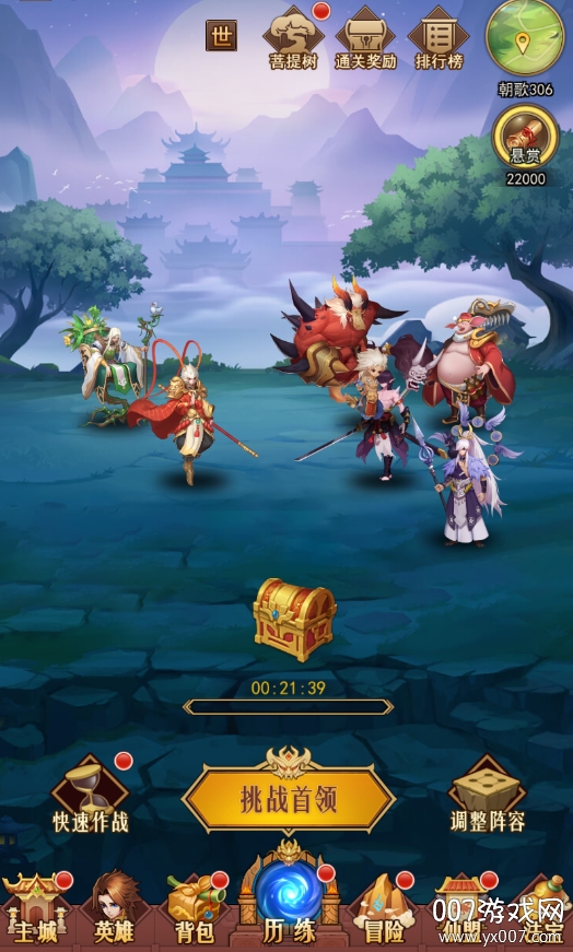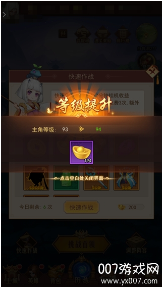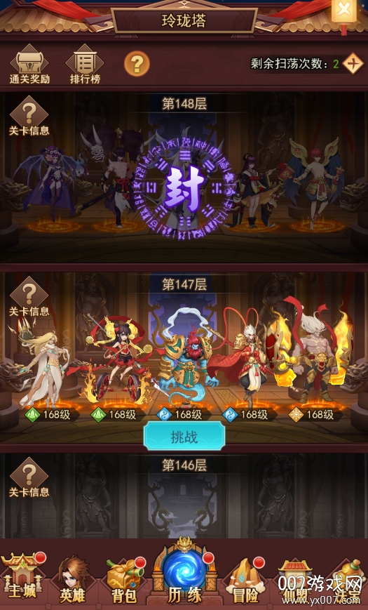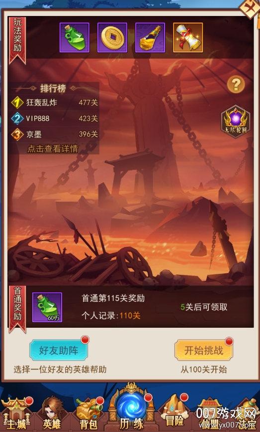 每通关1关会加成一次挑战奖励,奖励内容是金币、英雄经验。