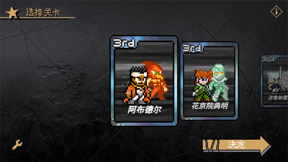 3、点击后会进入选关界面,向左滑动屏幕可以选择关卡,玩家选择好关卡后点击决定会进入选人界面