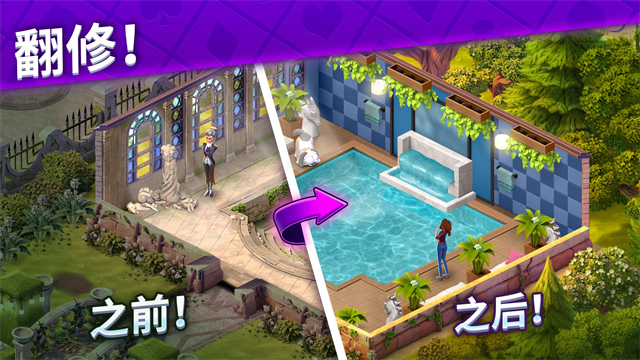 8、解决令人轻松愉悦的三峰纸牌谜题,展示你那令人惊叹的装修技艺,改造庄园的花园、大厅、卧室、书房以及更多场景!成千上万种设计选项和风格让你随心所欲地搭配出你心目中的梦想庄园!