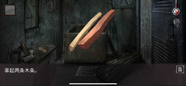 2、再去桌上看到绳子进行获取,点击绳子以及两根木棍就能合成一个道具,然后对着铁门使用。