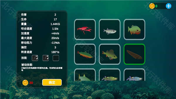 2、场景自由挑选,先用免费螃蟹开局,积累5鱼币后选攻击性鱼类自杀回主页。