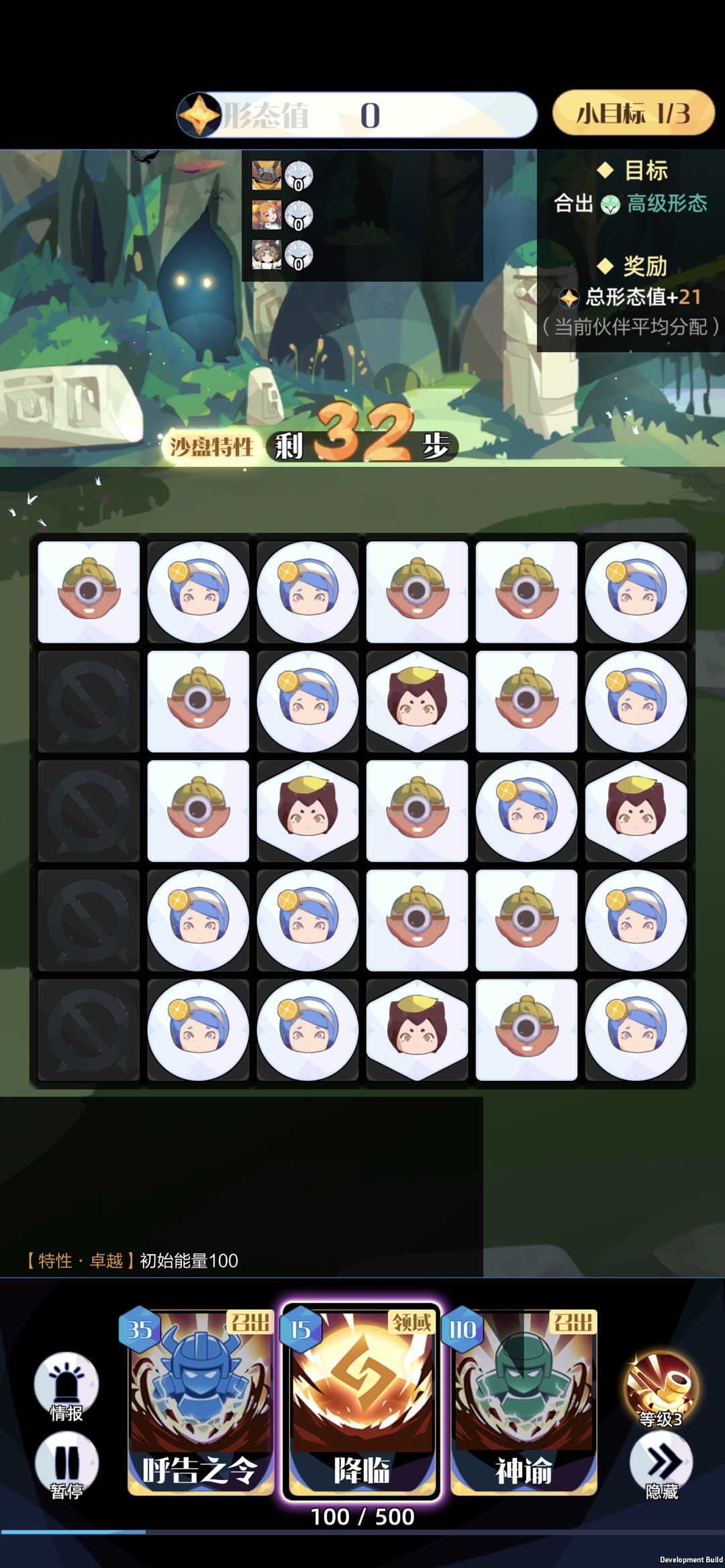 首先给大家讲解一下沙盘界面,在消除的基本操作方面是跟召合1一样,沙盘内所有伙伴格都可以自由交换,合成或者拖出伙伴可以获得形态值,形态越高可以获得的形态值也就越多。
