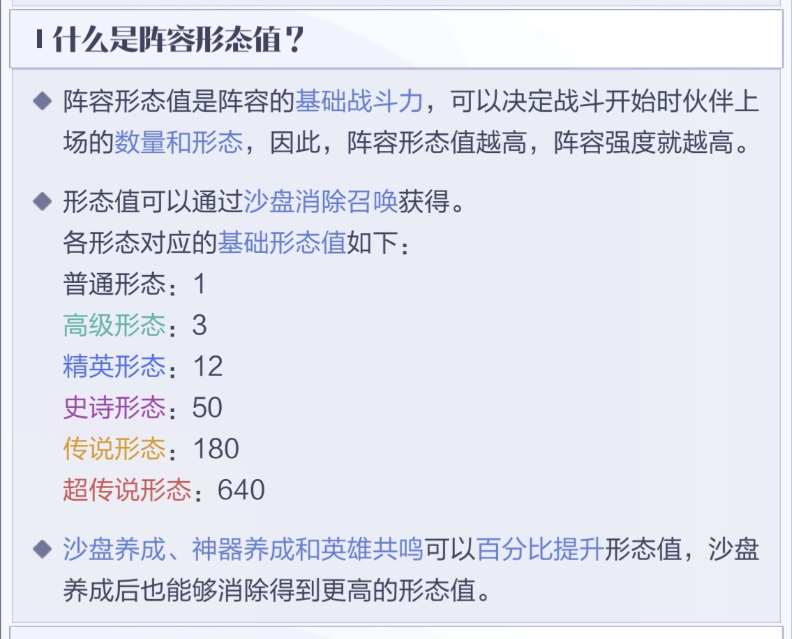 那么形态值是什么意思呢?形态值是阵容的基础战斗力,决定战斗开始时伙伴上场的数量和形态。可以换个说法,随着你的消除得分,对应的伙伴会进行升级,等到升级到一定等级就会进阶,那么想要战斗力更高,当然是等阶越高越好了。在沙盘界面上方会显示每个伙伴获取的形态值,当到达进阶条件就会自动进阶了。