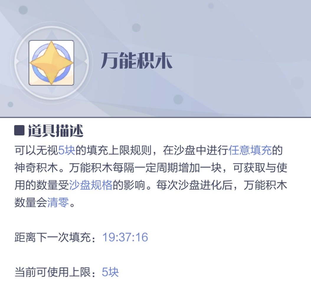 当然为了防止我们沙盘升级困难,在我们沙盘升级后的一段时间第一块为24小时会自动获取一格万能积木来帮助我们,更容易的填充沙盘,万能积木是不会占用我们本来的五块积木的。