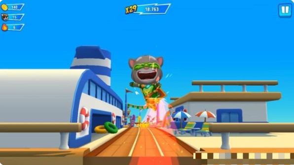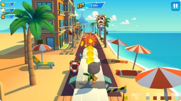 1、画风偏向q萌卡通可爱风的以汤姆猫系列为主题展开的跑酷类游戏;