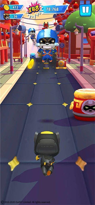 2、通过点击屏幕让汤姆猫进入到奔跑的状态,你可以进行跳跃、滑行等动作,避开路线上的障碍物。