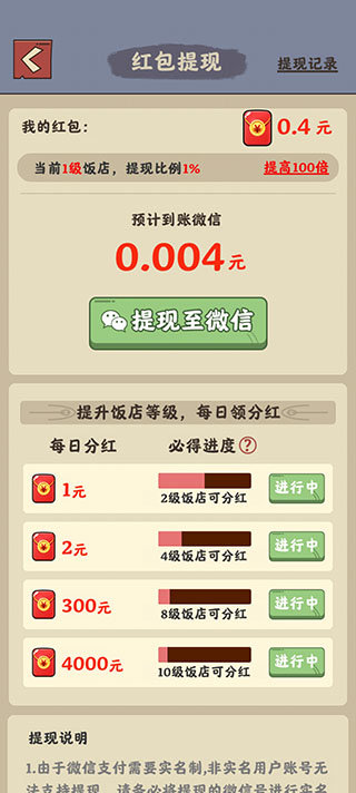 玩家点击左上角提现营,即可进入提现页面,满0.3元即可提现。