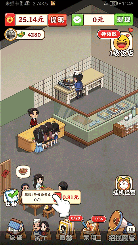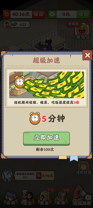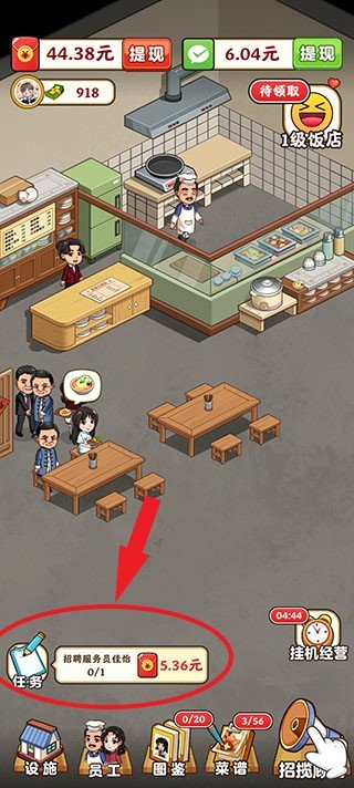 玩家点击右下角挂机经营,可以加速饭店进度。