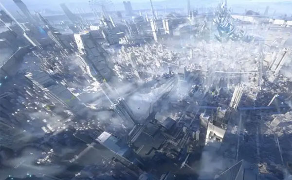 机械感十足的街景,若隐若现的空中建筑,雾气环绕的神秘主城