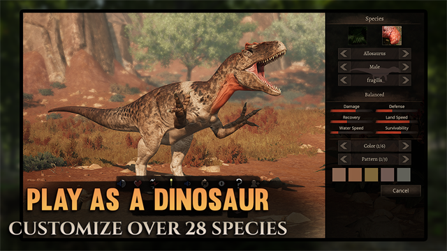 从刚孵化的婴儿开始,然后成长为成年恐龙!超过 25 种恐龙物种可供游玩,包括异特龙、棘龙、剑龙和肉鳄等最受欢迎的恐龙物种。狩猎和攻击其他玩家,保护自己,不要被吃掉成为 Panjura 的顶点!