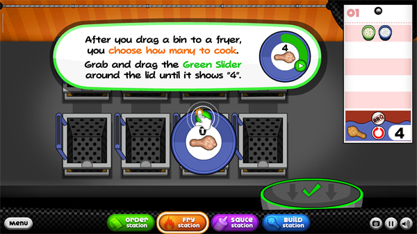 8、将盒子拖入炸锅后,你能够选择煮的数量。抓住盖子周边的绿色滑块并进行拖动,直至滑块显示“4”。