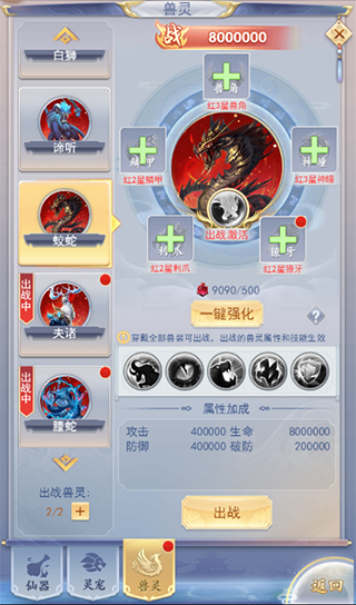 在游戏界面下角的仙灵系统中会有一个收集“兽灵”的系统分支,那里沉睡着山海经中的各种神兽,玩家必须通过集全兽角、神瞳、獠牙、利爪、鳞甲这五种兽灵装备才能使兽灵出战。