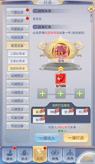 兽角除了可以通过击败灵兽岛上的神兽获得之外,还能像其余四件灵兽装备一样,消耗兽源石打造而成。