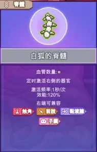 功能器官的右侧相邻位置,形式器官同样能够持续连接。像脊髓、肺、肠道这类定时触发的形式器官,其实际效能在于,左侧功能器官产生的每一个实体,在历经规定时长后,便会促使右侧功能器官发挥一次作用。举例来讲,要是“白狐的脊髓”“刺角蛹的触角”这类连接在右侧再次重复,整体效果就会呈现为大脑每1秒生成1个投射物,而且这个生成的投射物再过1秒后又会生成1个投射物。至于神经、视网膜、耳蜗等仅能连接在功能器官右侧相邻处的形式器官,它们所触发的效果正如其自身描述那般。心脏和膀胱仅能连接在大脑或者子嗣的右侧相邻位置,并且要满足特定条件才会触发。倘若连接在大脑右侧相邻位置,就需要角色本体符合条件才能触发;要是连接在子嗣右侧相邻位置,那么就需要该子嗣的某个实体满足条件才能够触发。