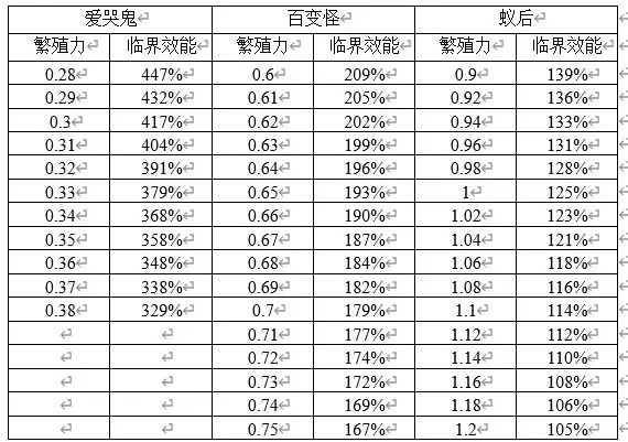 在子嗣使用过程中,需重点留意的特性在于,只有当它的繁殖力达到1时,才能生成子嗣实体。这就意味着,其左邻的形式器官,只有在效能属性达到一定数值时,才会发挥作用。接下来,我们将能使特定子嗣繁殖力恰好等于1的效能,称作临界效能。由于繁殖力仅整数部分有意义,所以形式器官的效能只有达到临界效能的整数倍,才会提升产生子嗣实体的效果。当子嗣放置在与大脑距离为2的位置时,其繁殖力需乘以0.8;若放置在距离为4的位置,繁殖力则乘以0.4。也就是说,距离4的子嗣的临界效能,是距离2的相同子嗣的2倍。下面的表格展示了不同繁殖力的距离2子嗣的临界效能。需要特别注意的是,爱哭鬼和百变怪的繁殖力随机范围不随稀有度变化,在挑选器官时务必关注这一点。而蚁后的情况是,稀有度越高,其繁殖力也就越高。