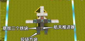 5、之后我们来制作飞机的后半部分,如图摆放三个铁块,在中间安装一个朝后的航天推进器,并在铁块后安装两个面向朝后的铰链方块: