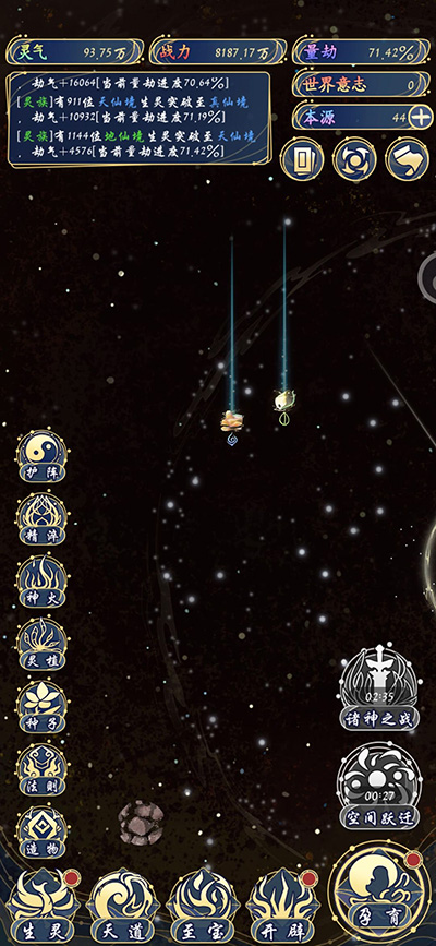 2、游戏目前有孕育、开辟、天道、至宝、生灵等玩法;