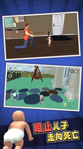 3、儿子做出危险行为时触发夸张动画,爸爸手忙脚乱的追防过程充满喜剧效果。
