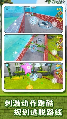 2、动态道具机关系统,包含旋转齿轮、伸缩栅栏等可互动障碍,需实时反应躲避。